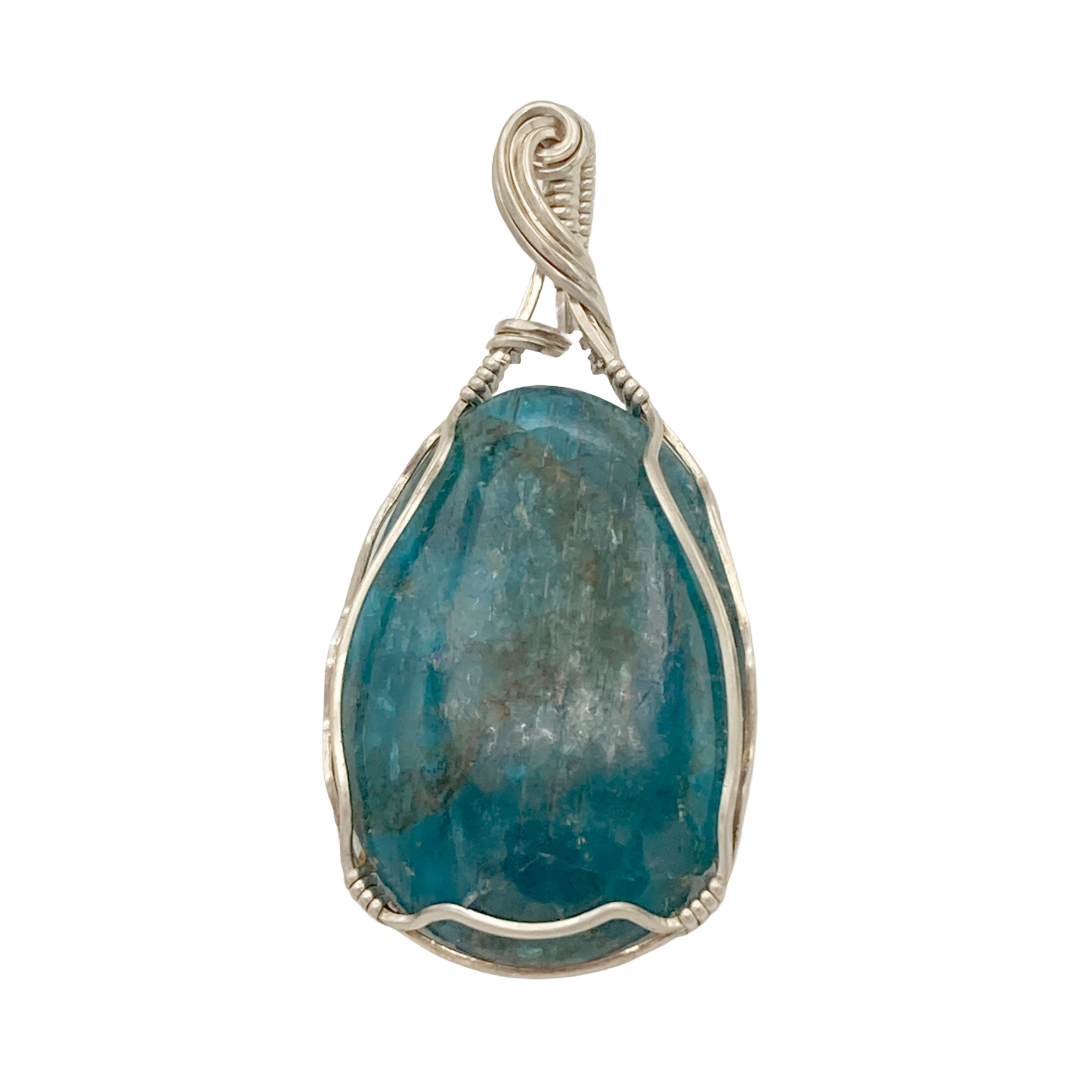 The Blue Apatite Twist Pendant combines the vibrant blue hues of natural apatite with the cool elegance of sterling silver. Its twisted sterling silver setting gracefully frames the gemstone, creating a refined and modern look. This pendant offers a sophisticated touch to any outfit, perfect for adding understated luxury to your everyday or special occasion wardrobe.