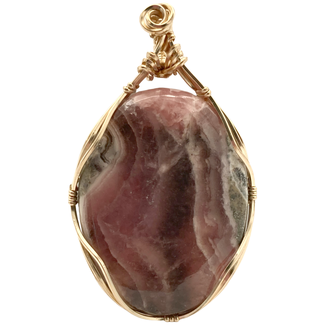 Elevate your elegance with this handmade Rhodochrosite Gold Twist Pendant. Featuring an oval-shaped rhodochrosite gemstone, its delicate gold twist setting enhances the stone's natural hues, creating a refined and timeless piece. Perfect for adding a touch of sophistication to any ensemble, this pendant balances artisan craftsmanship with understated luxury.