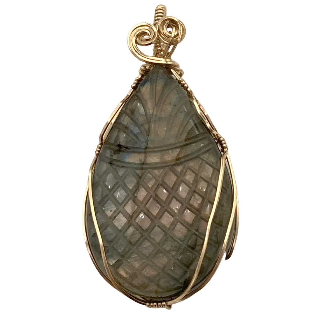 Elevate your elegance with the Pineapple Labradorite Heart Twist Pendant hand-wrapped in gold. Featuring a delicately carved pineapple-shaped labradorite stone, this pendant captures the gem’s shimmering play of colors, adding depth to its sophisticated design. The subtle heart twist detail brings a playful touch, making it an exquisite accessory that complements both casual and formal styles with refined charm.