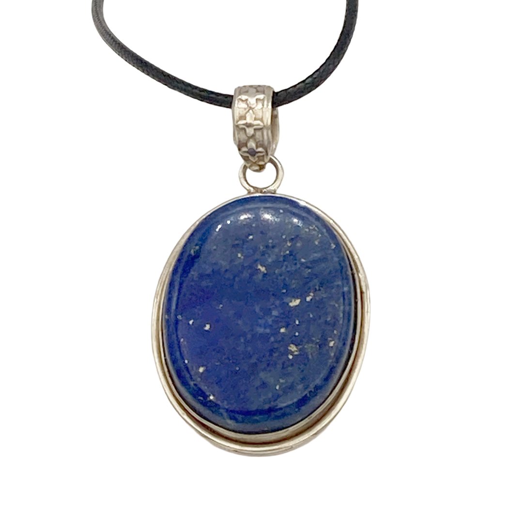 This Simple Lapis Lazuli Pendant features a refined circle design set in sterling silver. The rich blue lapis stone is accented with natural pyrite flecks, creating a delicate shimmer that enhances its timeless elegance. A sophisticated accessory that brings a subtle yet striking touch to any ensemble.