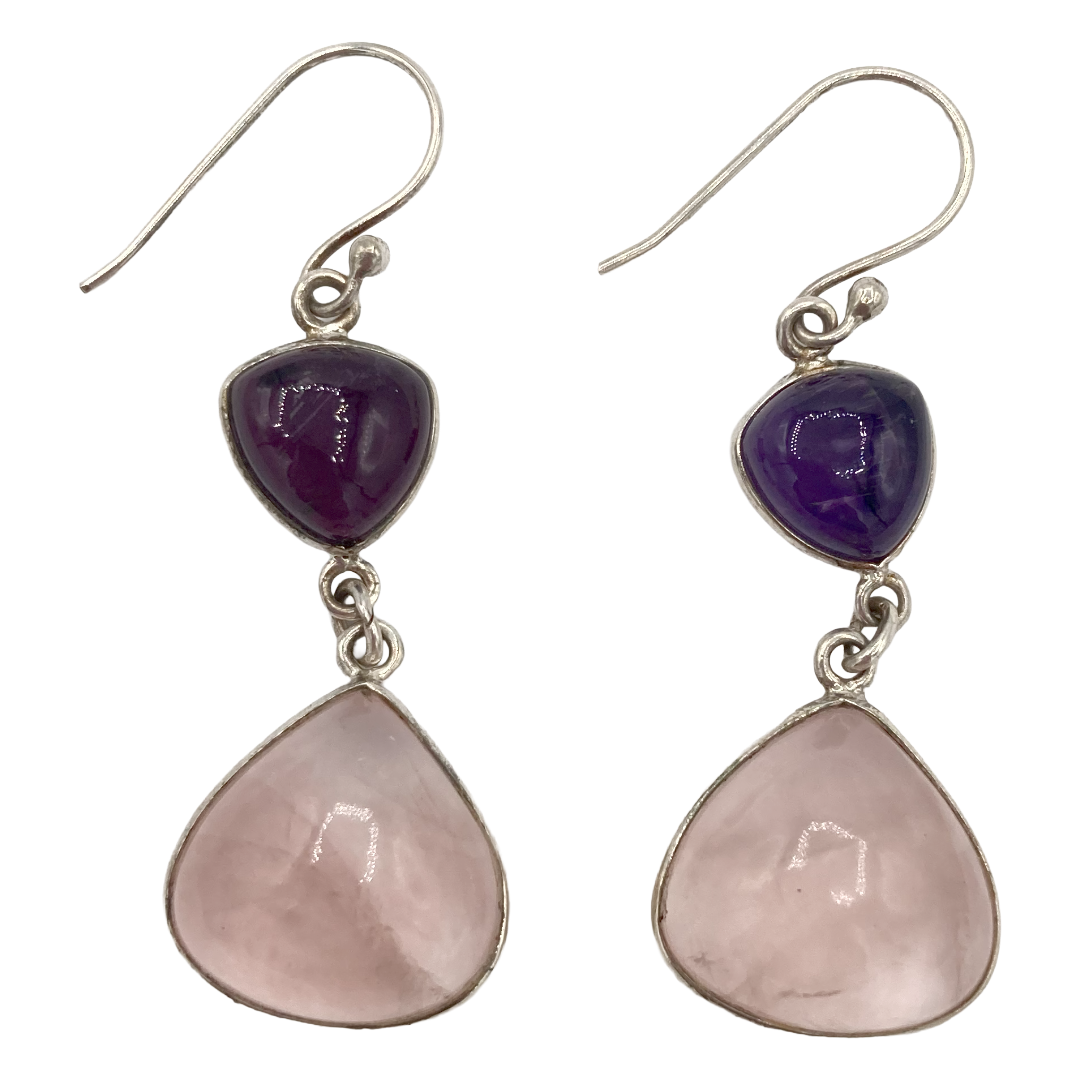 Add a splash of color and charm to your look with these playful Rose Quartz and Amethyst dangle earrings. The soothing pink hues of rose quartz paired with the rich purple glow of amethyst create a delightful duo that dances with every movement. Perfect for brightening up your day or turning heads at night, these earrings bring a fun and elegant touch to any outfit.